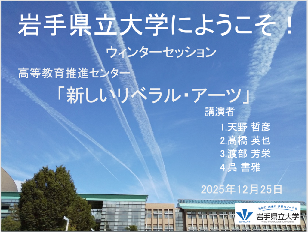 2025年12月25日、高等教育推進センターでは約200名の高校生を迎え、本学の特色ある教育の柱である副専攻制度を中心に、「新しいリベラル・アーツ」(担当:天野)、「基盤教育紹介」(高橋)、「地域創造教育プログラム」(渡部)、「国際教養教育プログラム」(高橋)、「課題解決型データサイエンス教育プログラム」(呉)の5つのテーマによる第一講義を行いました。